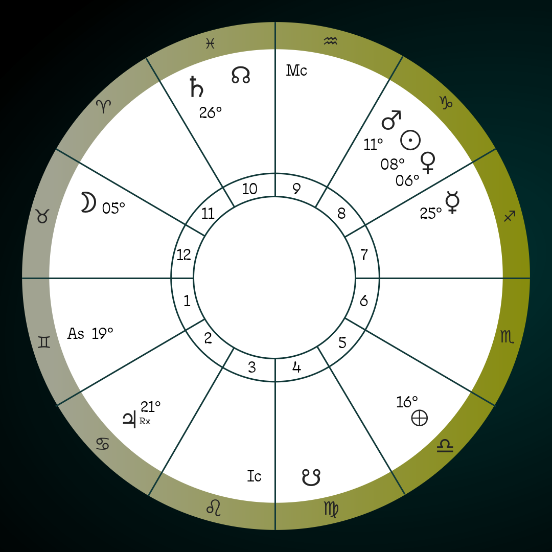Next, we analyze the condition of the Moon as the secondary significator. The Moon is separating from a trine with Mercury, the significator of the sick man, and applying to a trine with Venus at 6° Capricorn in the eighth house. Venus receives the Moon, as the Moon is in Taurus, the sign of Venus’s domicile. However, the Moon does not receive Venus, as Venus is in Capricorn, the sign of her exile. Additionally, the Moon is cadent in the twelfth house of long-term illness and is connecting with a planet in the eighth house, which is not a favorable testimony.